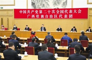 • 习近平在参加党的二十大广西代表团讨论时强调 心往一处想劲往一处使推动中华民族伟大复兴号巨轮乘风破浪扬帆远航