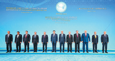 当地时间7月4日上午,国家主席习近平在阿斯塔纳独立宫出席上海合作组织成员国元首理事会第二十四次会议。这是习近平同上海合作组织成员国领导人集体合影。 |