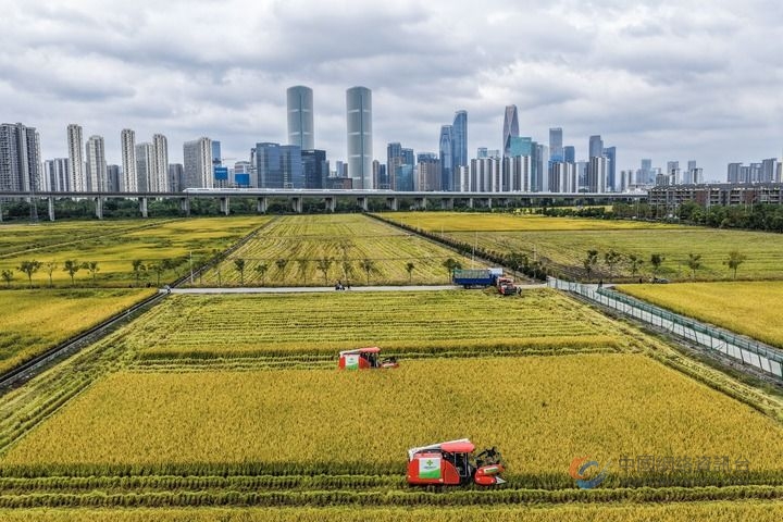 2025年10月21日,收割机在浙江省杭州市萧山区世纪田园粮食功能区的稻田里收割水稻,远处高铁列车飞驰而过(无人机照片)。新华社记者 徐昱 摄