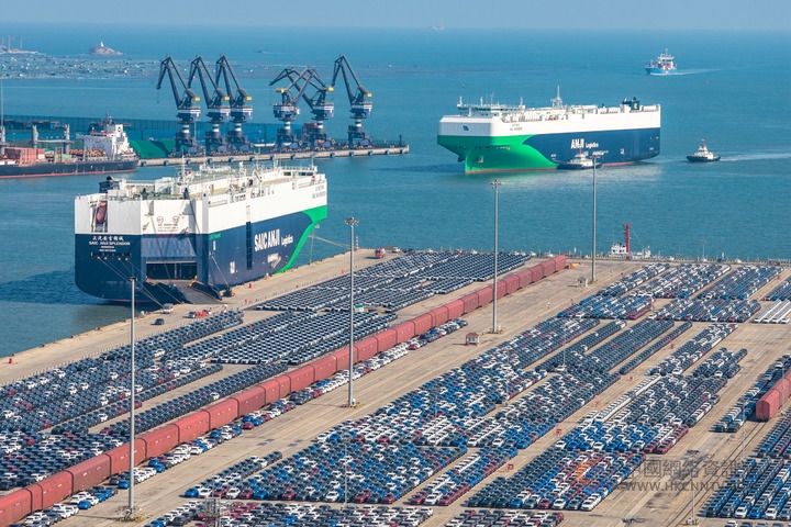 2026年1月27日,在山东港口烟台港,汽车运输船在装载出口商品车(无人机照片)。新华社发(张超 摄)