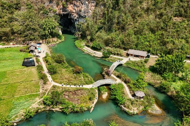 2026年3月17日,游客在云南省文山壮族苗族自治州广南县坝美景区游览(无人机照片)。近年来,当地深入挖掘坝美村农文旅融合发展潜力,一方面打造沉浸式旅游体验项目,让游客在欣赏自然风光的同时,感受壮乡传统农耕文化;另一方面景区积极吸纳本地村民就业,鼓励其因地制宜创业增收,推动农业与旅游业互促共进。新华社记者 彭奕凯 摄