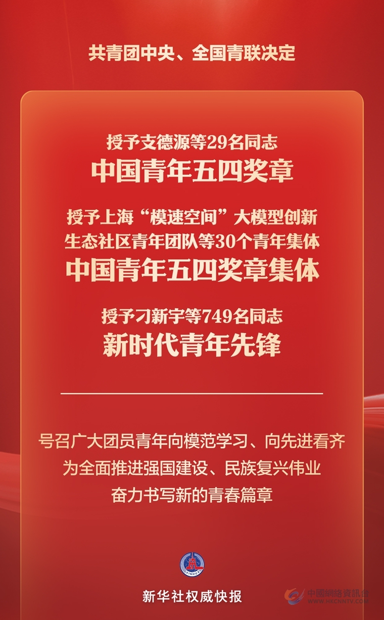新华社北京4月27日电(记者王明玉)为表彰先进、树立典型,集中展示新时代中国青年的精神品格和价值追求,共青团中央、全国青联决定,授予支德源等29名同志中国青年五四奖章,授予上海“模速空间”大模型创新生态社区青年团队等30个青年集体中国青年五四奖章集体,授予刁新宇等749名同志新时代青年先锋。
